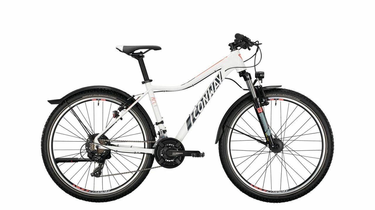 Praktisch & geländegängig<br>Das MCL 327 von CONWAY ist eine gelungene Mischung aus Mountainbike und Trekkingrad. Mit robustem Mountainbike-Rahmen und Federgabel fürs Gelände und mit Schutzblechen und Lichtanlage für den täglichen Stadteinsatz.<br><br>Das L im Modellnahmen steht für Lady, und damit ist nicht (nur) das frische Design gemeint, sondern vielmehr der Lady-Sattel von CONWAY sowie die kürzere Rahmengeometrie fürs entspannte Cruisen. Den kürzeren Abstand zwischen Sattel und Lenker und damit die entspannte Sitzposition erreicht das Bike unter anderem durch den Knick im Oberrohr, was aber auch für mehr Überstandshöhe sorgt.<br><br>Dass das MCL 327 die Ansprüche zwischen Stadt und Gelände schafft, zeigen die breiten Reifen: mit dem feinen Stollenprofil greifen sie im Gelände gut, dämpfen auch auf Kopfsteinpflaster gut und sind mit dem Reflexstreifen zudem verkehrssicher ausgerüstet. Fürs Gesehenwerden sorgt auch das LED-Rücklicht mit Standlicht-Funktion, und damit man selbst gut sieht, dafür sorgt der LED-Scheinwerfer, ob nun auf Touren im Gelände oder Stadt.