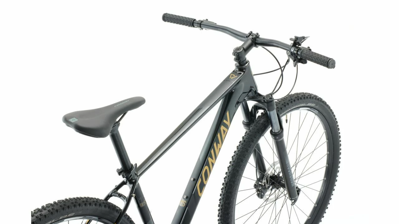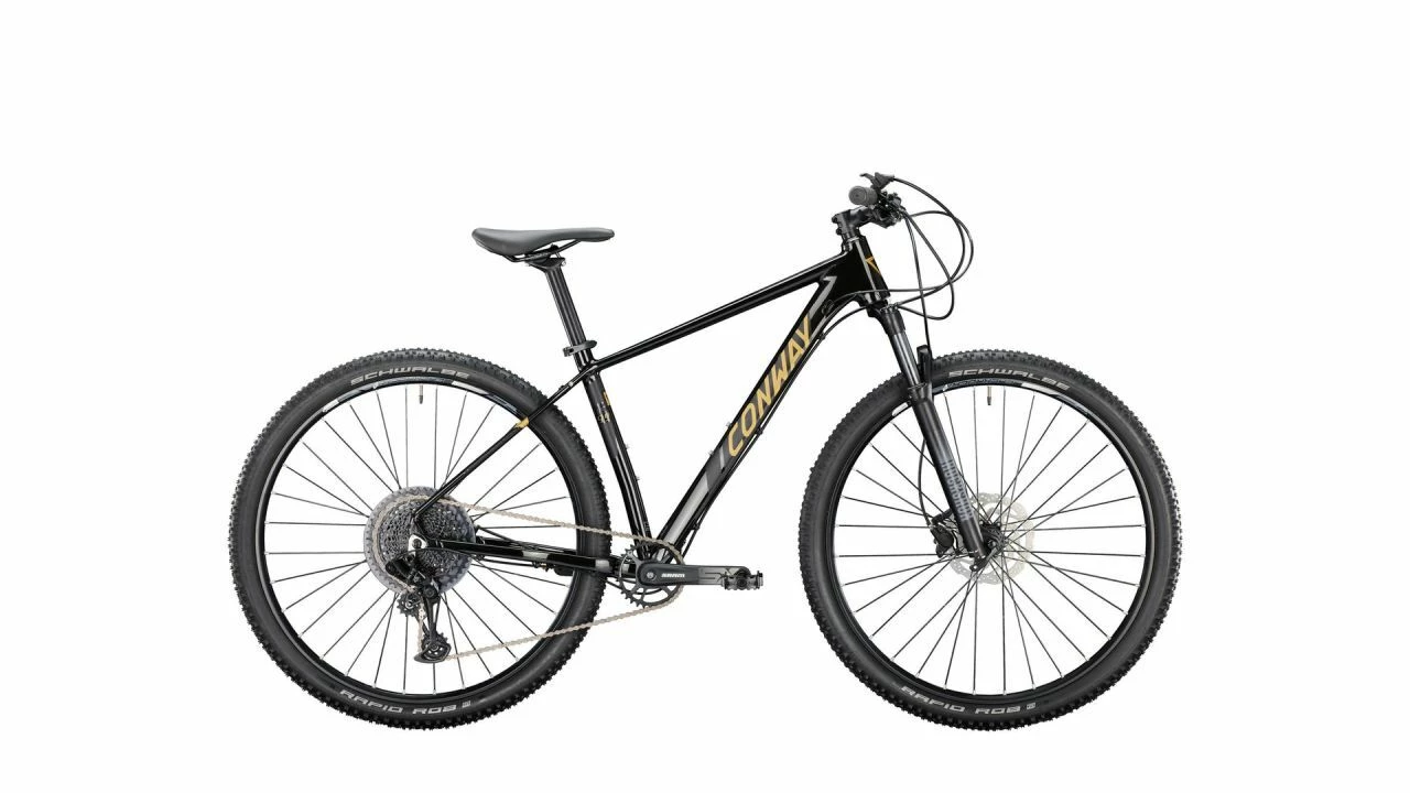 Wer mit dem CONWAY MS 9.9 unterwegs ist, stellt schnell fest: Das Hardtail ist ein echter Allrounder. Ob querfeldein, auf Schotterpisten oder verspielten Trails – das Allround-MTB fühlt sich überall zuhause.<br>Dafür ist neben der sportlich-ausgewogenen Fahrweise zuvorderst die Judy TK Solo Air von ROCKSHOX mit ihrem 100 mm Federweg verantwortlich. Damit ist das Bike für den sportlichen Einsatz gerüstet und punktet mit Komfort.<br><br>Mit bestem Überrollverhalten geht's über Steine und Wurzeln, dazu die 29er SCHWALBE Reifen Rapid Rob. In dem Reifenumfang und in 57 mm Breite ist auch die Auflagefläche der profilierten Reifen hoch, was den sicheren Grip auf Schotter und Waldboden mit erklärt.<br><br>Mit der 12-fach SRAM NX Eagle-Schaltung kurbelt man dazu lange Anstiege und kurze steile wie giftige Rampen hoch – die breite Abstufung der Kassette mit 11-51 Zähnen machts möglich, und ebenso den Zielsprint auf der Feierabendrunde. Der Antrieb spart sich auch den Umwerfer und einen Schalthebel, was im wahrsten Sinne des Wortes einfachen Schaltspaß bereitet.<br><br>In der Abfahrt hingegen punkten am MS 9.9 die Federgabel und die griffigen Reifen, mit denen man das Hardtail richtig laufen lassen kann. Dabei halten die SHIMANO BR-MT200 hydraulischen Scheibenbremsen das Bike im Zaum. Mit vorne 180 mm und hinten 160 mm Scheibendurchmesser bieten sie anständig Reserven fürs feinfühlige Einteilen der hohen Bremskräfte auf allen Cross Country- und Marathonkursen und allen Touren durch die Natur.