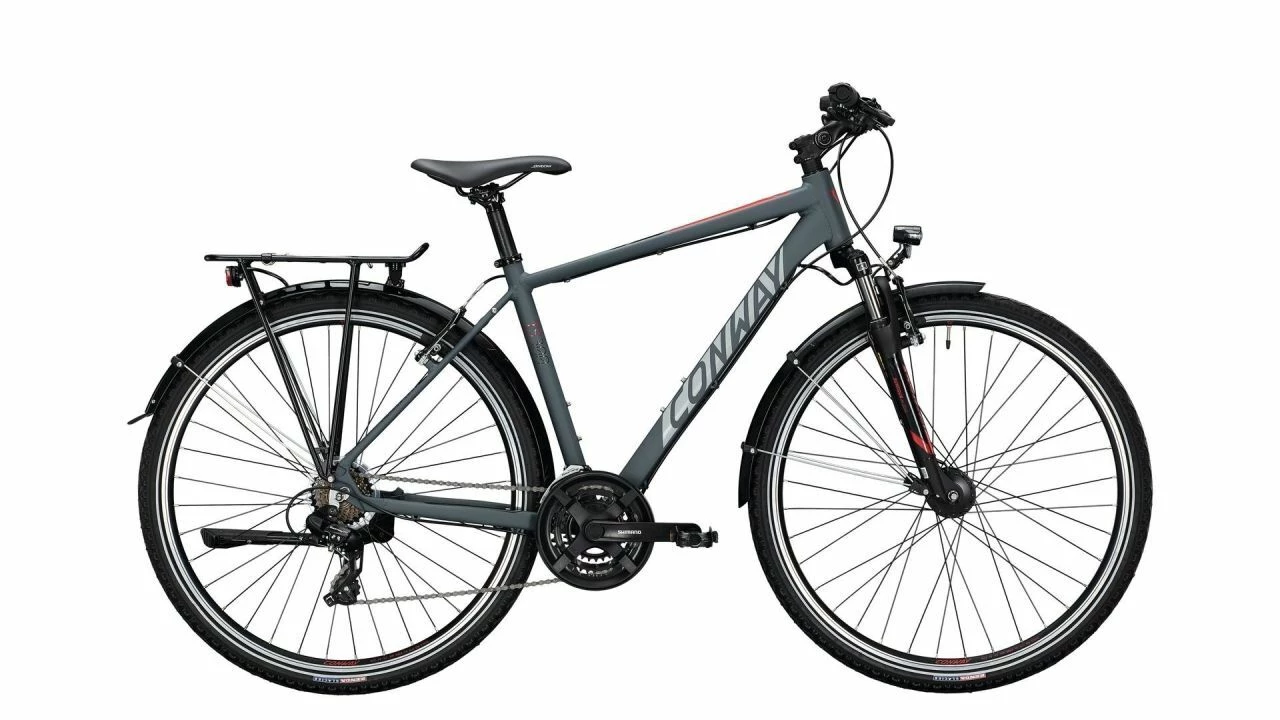 Das CONWAY TS 300 ist einer dieser zuverlässigen Begleiter auf Touren und im Alltag, ein Trekkingrad eben. Es macht dank Vollausstattung im Alltag alles mit Einkäufe nimmt der Gepäckträger über Radtaschen mit, im Stadtverkehr ist es angenehm wendig und läuft auf Touren ebenso souverän geradeaus. Die angenehm sportliche Sitzposition, die der Alu-Rahmen ebenso vorgibt, lädt zum täglichen Touren natürlich auch ein. <br><br>Bei der Ausstattung bringt das TS 300 ebenfalls alles mit: Alles, was der Gesetzgeber vorschreibt, wie das LED-Licht mit Nabendynamo und die Reflektoren; und alles, was im Alltag praktisch ist, wie die Schutzbleche, die ergonomisch geformten Griffe, den stabilen Hinterbauständer oder die moderat profilierten Reifen. Dass der Gepäckträger über die Unterlaufstrebe gleich auch das Schutzblech hält, ist nur ein weiteres Beispiel für das optische Understatement bei technischer Zuverlässigkeit. Auf allen Wegen im Alltag und auf Tour. Als Herren und Trapez-Rahmen-Variante erhältlich.