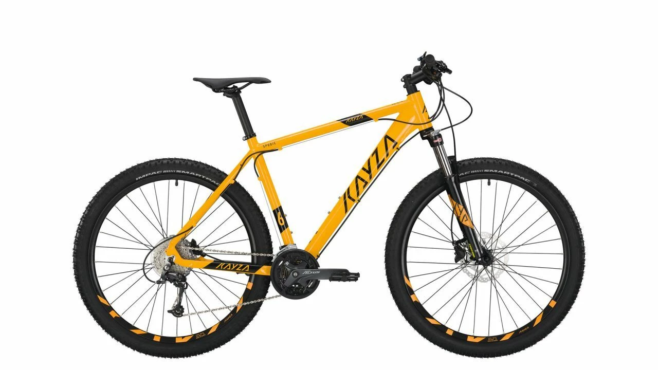 Wer bei seinen Touren am Wochenende von den Wald- und Feldwegen am liebsten auf den nächsten Singletrail abbiegt, bekommt mit dem Spodic 6 von KAYZA einen überaus soliden Gefährten, der viel mitmacht. <br><br>Mit seinen 27,5''-Laufrädern und der Rahmengeometrie lässt sich das Hardtail flott beschleunigen und agil um die Kurven steuern. Beim Vortrieb unterstützt der Shimano Deore/Altus-Mix mit seinen 3 x 9 Gängen, während die SR Suntour Federgabel sich anschickt, den Boden einzuebnen. Zuverlässig sind dabei die Shimano MT-200 hydraulischen Scheibenbremsen. <br><br>De Impac-Reifen sind mit ihren feinen Stollen für Feld- und Forstböden gemacht, gleichzeitig laufen sie auch anständig auf Asphalt. Für Stadtfahrten lässt sich die Gabel übrigens auch vom Lenker aus abstellen. In der cleanen Farbgebung in Mango/Black macht das Spodic 6 so auch eine gute Figur.